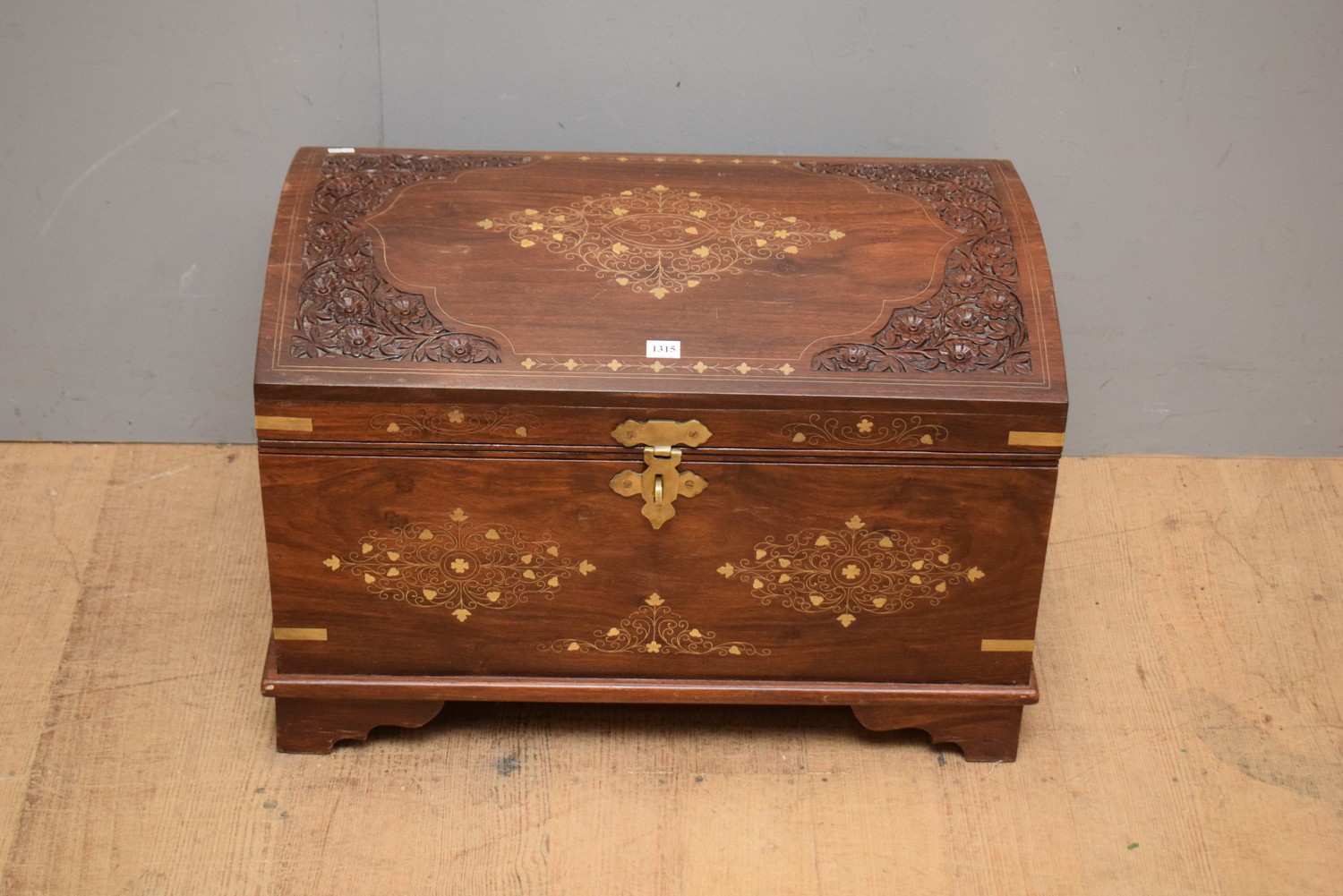 A CARVED TIMBER AND BRASS INLAID STORAGE TRUNK (42H X 63.5W X 42D CM)