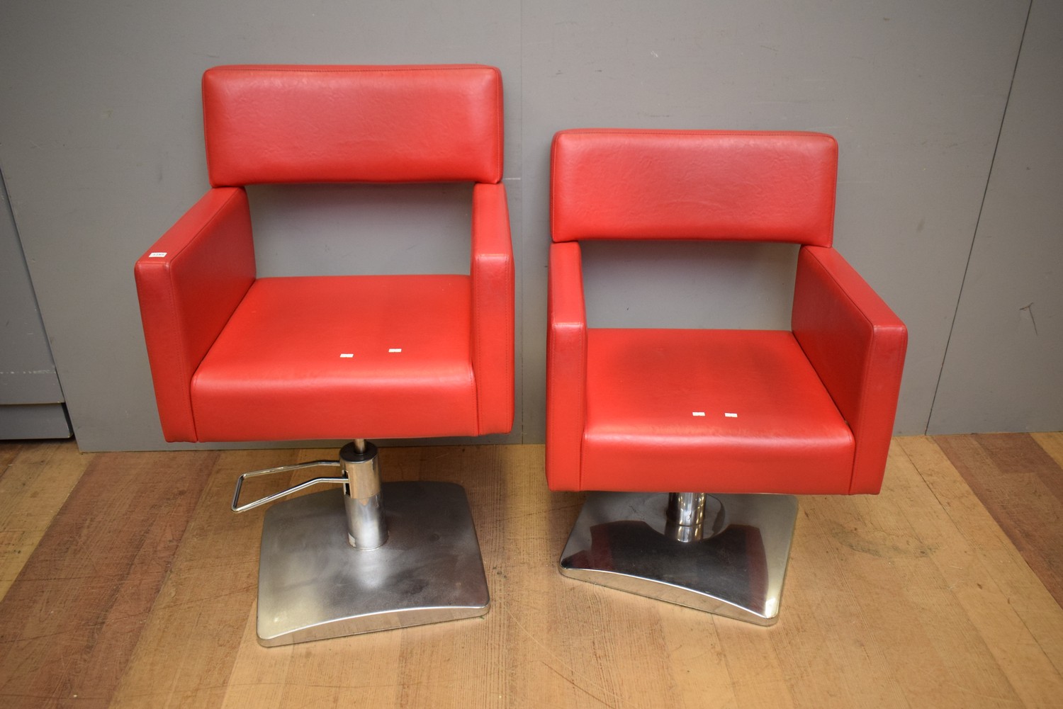 A PAIR OF CONTEMPORARY CHROME AND LEATHER SWIVEL CHAIRS (PLEASE NOTE THIS HEAVY ITEM MUST BE REMOVED BY CLIENTS OR CARRIERS AT THE CUSTOMERS EXPENSE. LEONARD JOEL STAFF CANNOT ASSIST CARRYING THIS ITEM) (A/F) (105 CM H ADJUSTABLE)
