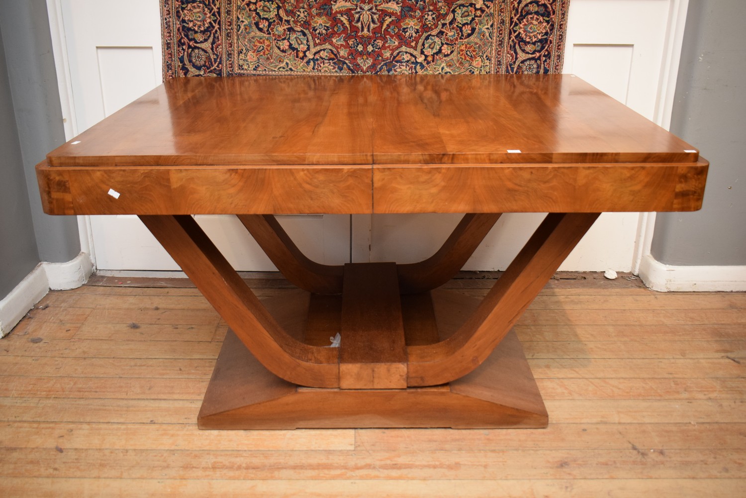 A FRENCH ART DECO BLONDEWOOD DINING TABLE (76H X 140W X 108D CM) (PLEASE NOTE THIS ITEM MUST BE REMOVED BY CLIENTS OR CARRIERS AT THE CUSTOMERS EXPENSE)