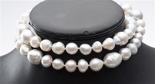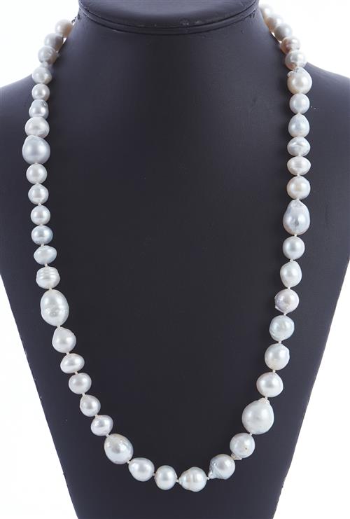 A STRAND OF FIFTY THREE SOUTH SEA PEARLS (MATINEE LENGTH) IN VARYING SHAPES AND SIZES, TOTAL LENGTH 700MM