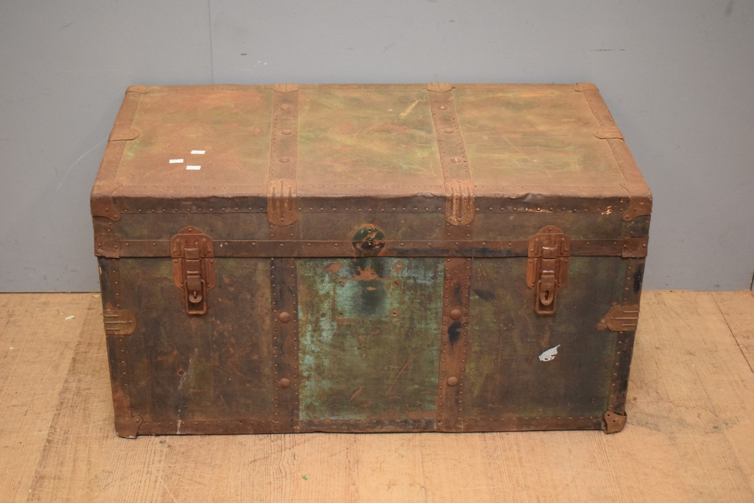 A RUSTIC METAL BOUND TRUNK (A/F) (46H X 88W X 47D CM)