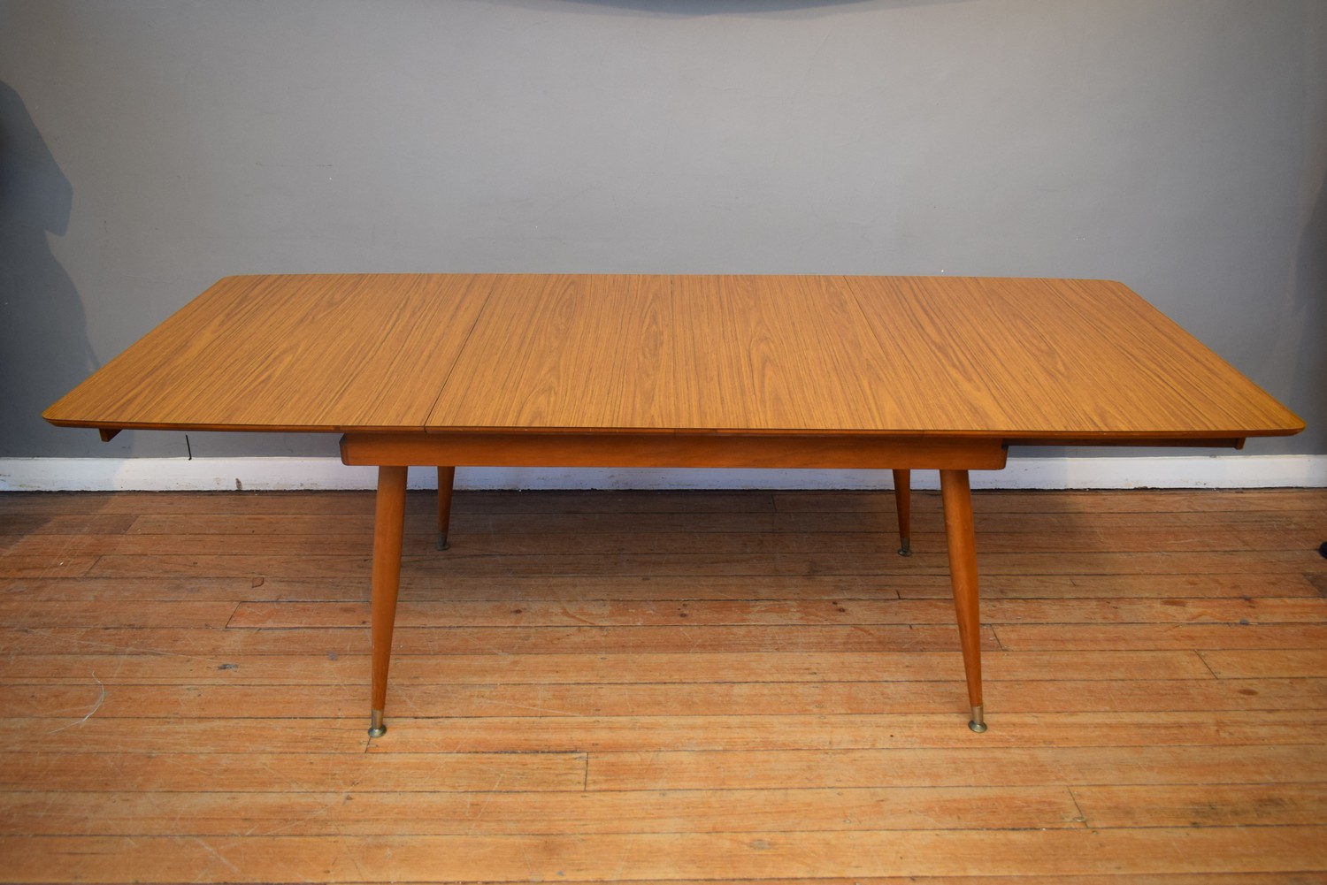 A HIGHLY SOUGHT AFTER MID-CENTURY MODERNTONE BUTTERFLY LEAF EXTENSION DINING TABLE, MELBOURNE MADE WITH MAKER'S MARK PLAQUE (EXTENDED 223.5 CM X 90 CM, CLOSED 137.5 CM)