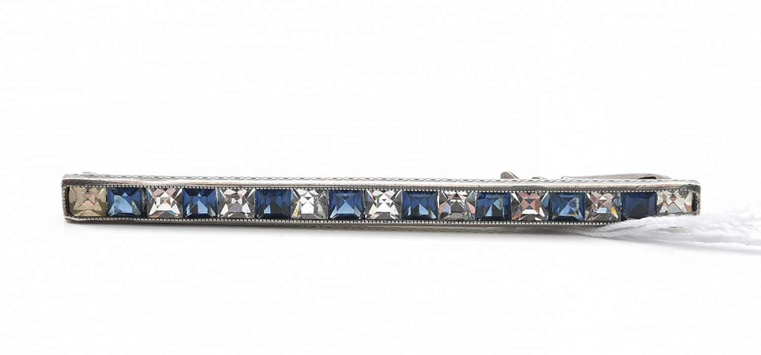 AN ANTIQUE FRENCH BAR BROOCH SET WITH BLUE AND WHITE PASTE, IN SILVER, HALLMARKED, NAPOLEON III ERA, TOTAL LENGTH 60MM