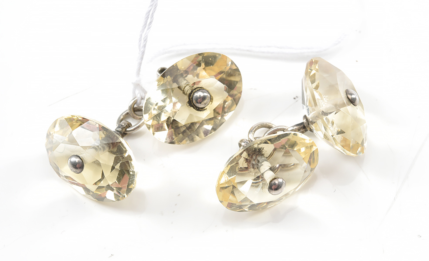 A PAIR OF EDWARDIAN FACETTED CITRINE SET CUFFLINKS IN SILVER