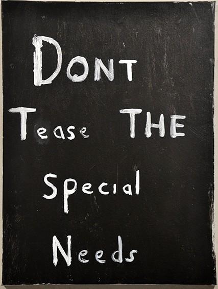 Don't tease the special needs is an exceptional example of the collaborative work created by Richard Lewer and Eden Menta for the 2016 group exhibition 'Telltale'. As described in Lot #9, the collection included self-portraits, artists and studio staff, as well as text and titles that reflected negative statements commonly made toward marginalised people. Menta is an emerging multidisciplinary artist who has worked at Art Project since 2013. She showed with Janelle Low as part of the 2019 Ballarat International Foto Biennale. Lewer is an established artist, who received the Basil Sellers Art Award in Melbourne in 2016 and is represented by Sullivan+Strumpf, Sydney; Hugo Michell Gallery, Adelaide; and Suite Gallery, Auckland.