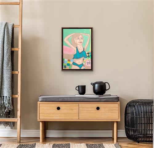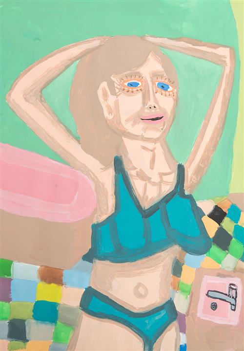 Cathy Staughton is an established artist, with a 30+ year career. Primarily a figurative painter, her distinctive style speaks volumes through her bold and vivid approach to working. Her quirky style emblazons her paintings, which reflect a distinct good-bad dichotomy, as well as retaining overtones of pathos and humour. Often painting people she knows—as well as icons, angels, robots, and cats—her artworks bare all: every raw emotion, line and wrinkle. Her 2019 artwork Catherine Bell Jane Mum Bathroom is influenced by her close friend and collaborator artist and academic Dr Catherine Bell. Staughton has worked at Arts Project since 1989 and has had four solo shows including at MADMusée, Liège in 2002. She has exhibited in numerous curated national and international group exhibitions and has work in collections worldwide.