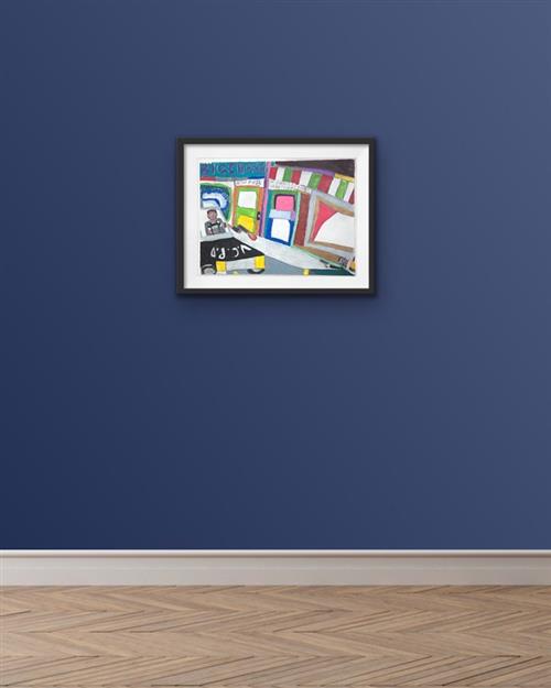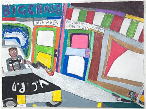 Michael Licenblat is an emerging artist whose practice centres on drawing and digital art. The works display his reverence for and fascination with crime-based 'cops and robbers' TV shows, amplifying action-packed drama and larger-than-life characters. In Big Chase sirens blare and a gun fight explodes as the officer and bandit participate in a seemingly gleeful showdown. Michael Licenblat has worked in the Arts Project Australia studio since 2017 and his work has featured in numerous group exhibitions in Melbourne. His work is held in private collections.