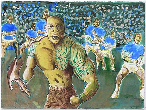 Armani Tia is a confident draughtsperson equipped with a natural aptitude for drawing. His varied subject matter pays homage to influential artists and musicians. Recently, his focus is on representing seminal moments in his life, as well as exploring his Samoan cultural roots. His work in the auction, Magiagi, depicts the powerful Siva Tau war dance performed by Samoan sporting teams before each match. Tia has worked at Arts Project since 2013. In 2017 he undertook the Bundoora Nebula Residency at Bundoora Homestead Art Centre. His work has been shown in numerous group exhibitions.