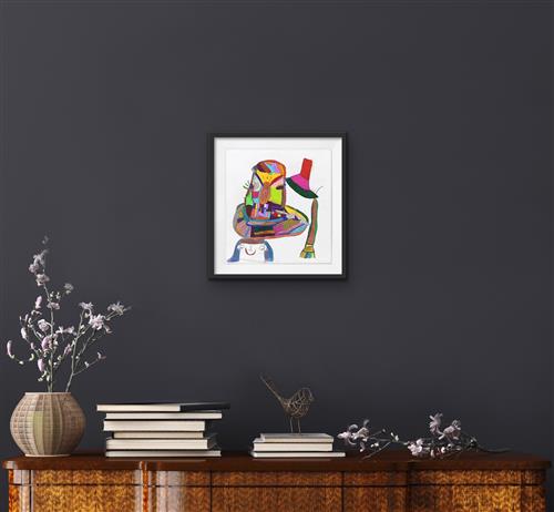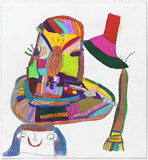 Suzanne Barnes is an emerging artist working in pencil and gouache. There is an ease to Barnes' graphical artmaking, her drawing style confident, varied and open to experimentation. Not titled resonates with surreal charm, the subject adorning what appears to be a spider-occupied hat head that in turn lifts its own hat in greeting. Susanne Barnes has worked in the studio at Arts Project Australia since 2017.