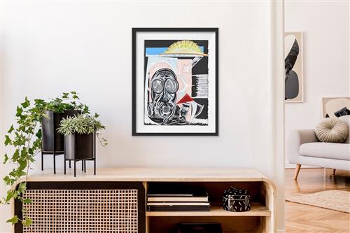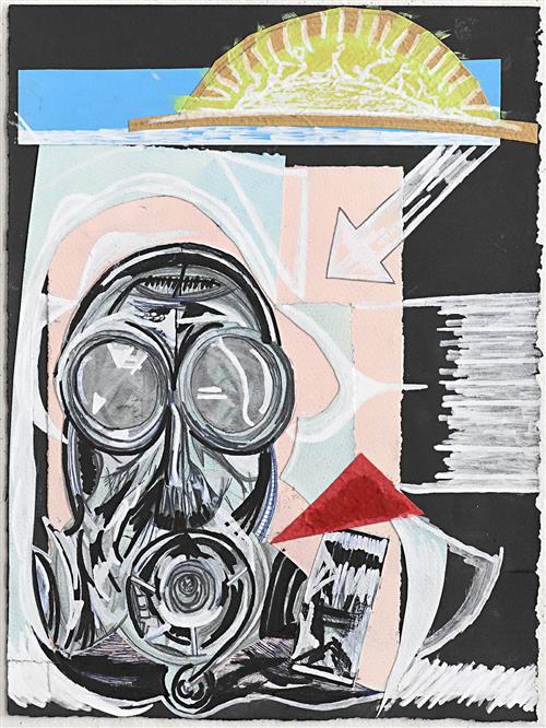 Michael Camakaris' works are imbued with drama, depth and intensity, abstracted through the use of bold outlines, compelling contrasts and a tenacious structure and dynamism. With a nod to cubism and surrealism, Carmakaris explores ideas surrounding industrialisation and the environment, offer a brewing sense of foreboding. Collage with Gas Mask features two opposing realities – sunshine and blue sky or darkness and gas masks, the arrow pointing to the latter suggesting impending doom. Camakaris has worked at the Arts Project Australia studio since 2010, and presented his first solo exhibition 'Five Bulls, No Bull' as part of the Shepparton Art Museum Drawing Wall Commission in 2013.