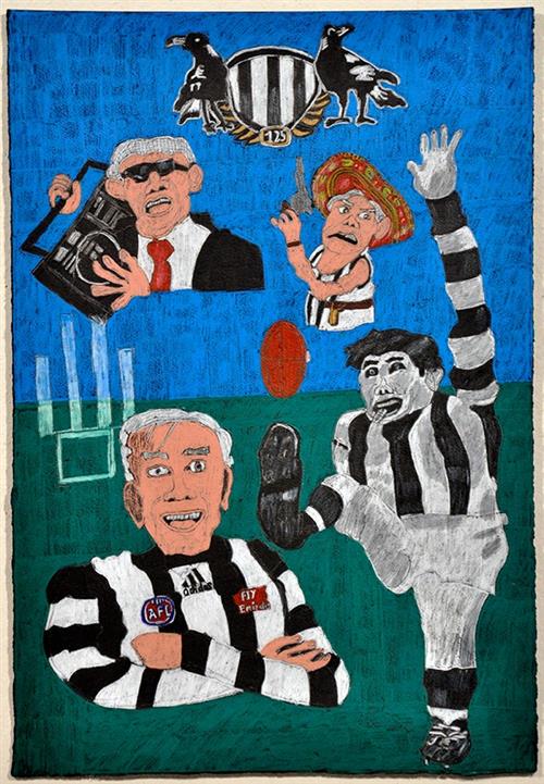 Adrian Salvatore's character-packed drawings pay homage to events, activities and personalities that bring a community together, and in Australia sport has an enormous part to play in such occasions. In his works on paper Salvatore achieves a dense, detailed and highly resolved aesthetic, and Lou Richards Collingwood legend 1923 – 2017 exemplifies Salvatore's practice in this medium. The piece features the iconic Richards in various poses at varying stages of his life – a tribute to the colourful character. Adrian Salvatore has been attending the Arts Project Australia studio since 2011.