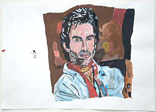 Bobby Kyriakopoulos' practice focuses primarily on painting and drawing, with a meticulous and deliberate application of watercolour and gouache. His depiction of stills from film and tv productions are particularly magnetic, the highly gestural work seemingly capturing the subject matter in direct gaze with the viewer. Ridge, featuring the fictional character Ridge Forester from Days of Our Lives, pays homage, arguably ironically, to the actor, showcasing his characteristic interplay of positive and negative space. Kyriakopoulos has worked at Arts Project Australia studio since 2011. His work is held in the National Gallery of Victoria collection.