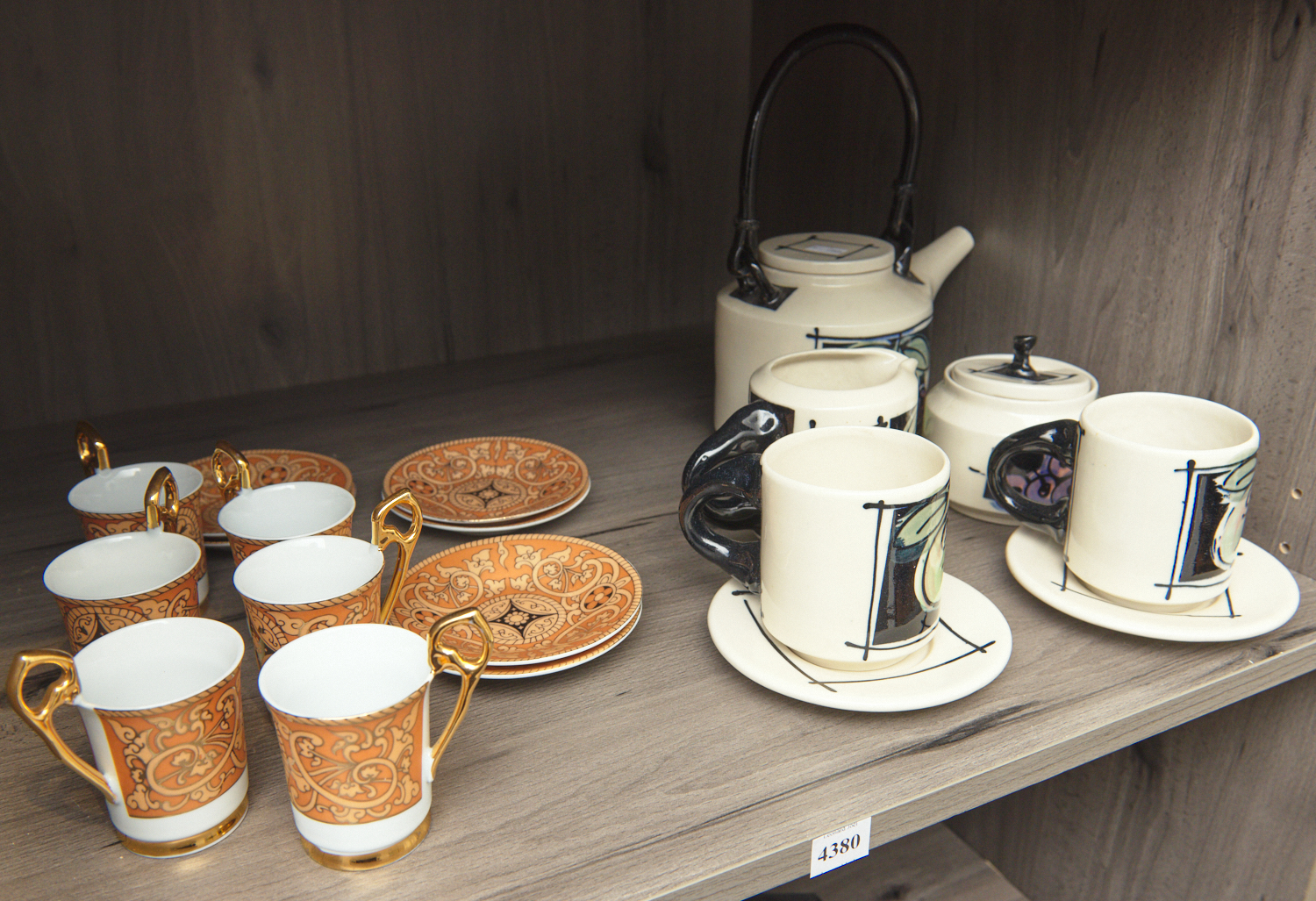 SHELF OF PORCELAIN INCLUDING VINTAGE TEASET SIGNED 'SJ' TO BASE AND DEMITASSE COFFEE SET