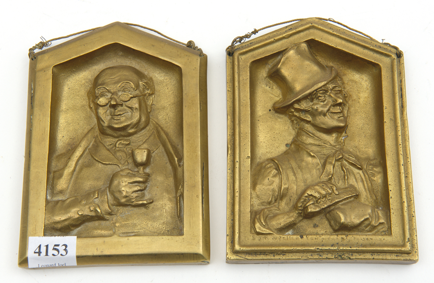 A PAIR OF HEAVY BRASS PORTRAIT PLAQUES OF TAVERN FIGURES