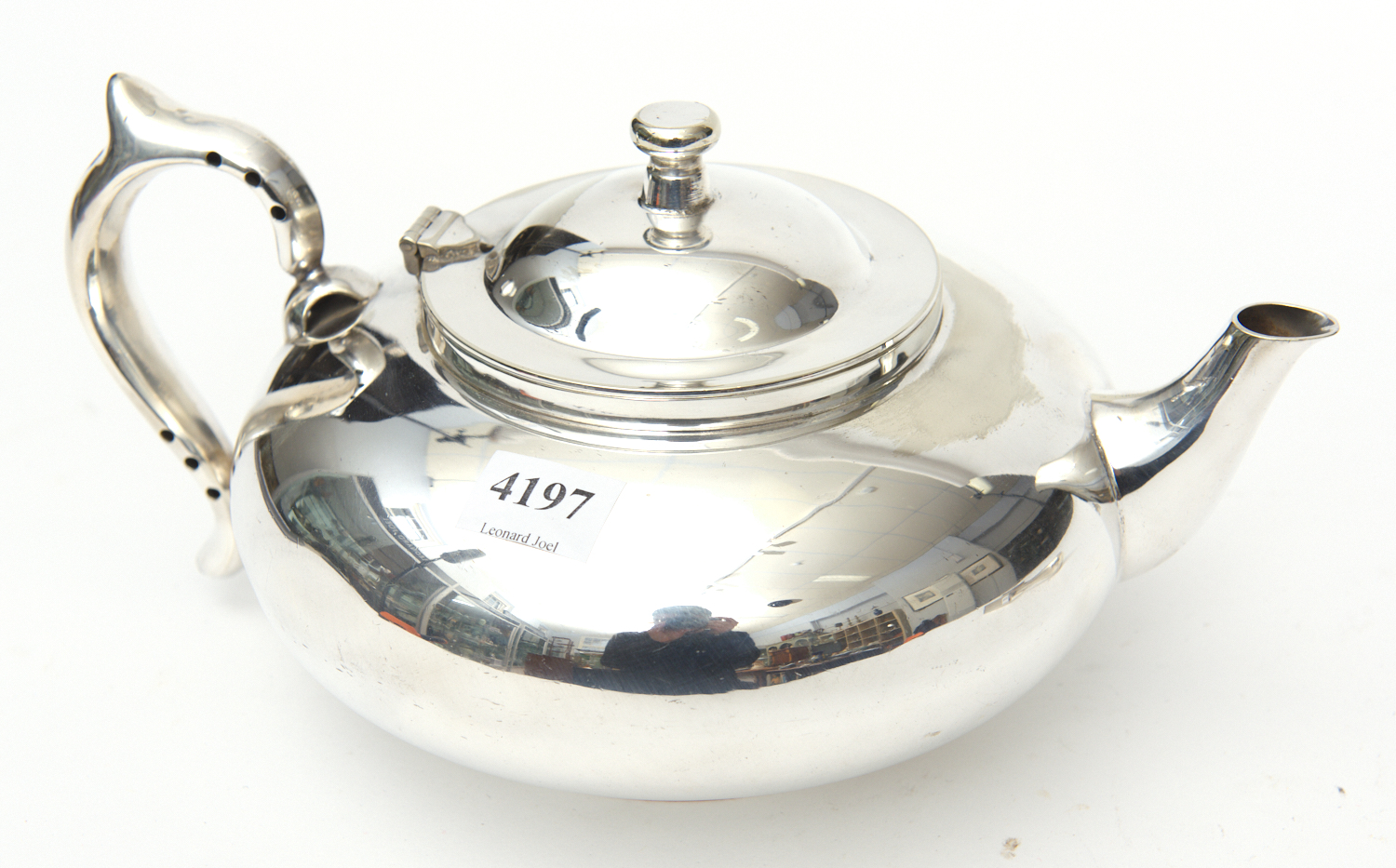 A SILVERPLATE ROBUR EIGHT CUP TEAPOT WITH INFUSER, (DENT TO BODY)