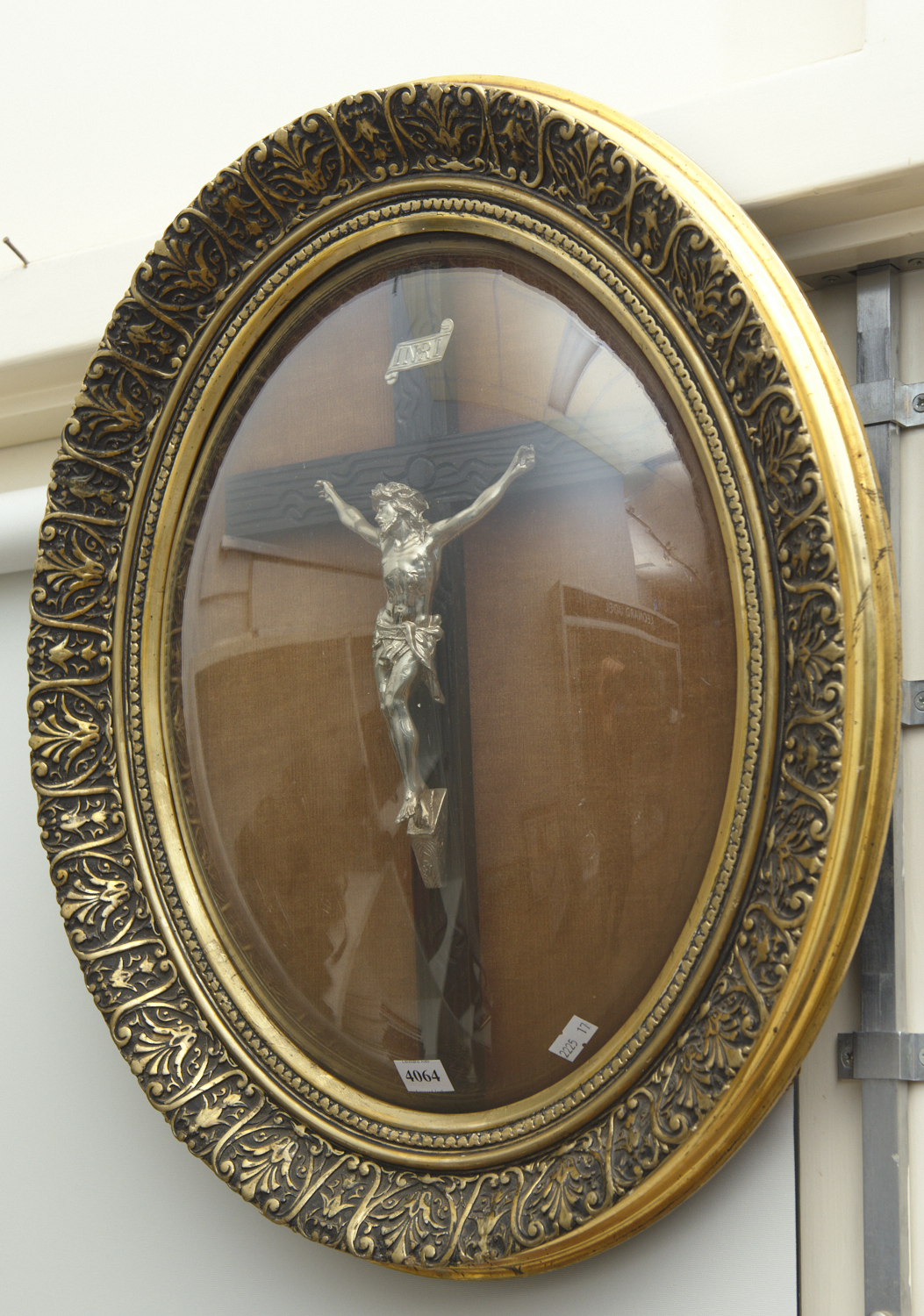 A 19TH CENTURY GILT FRAMED SILVERED BRONZE CRUCIFIX WITH DOME GLASS