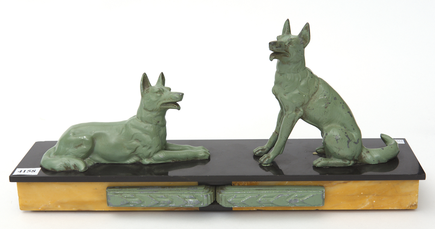 A 1920S ART DECO SPELTER AND MARBLE DOG STATUE (A/F)