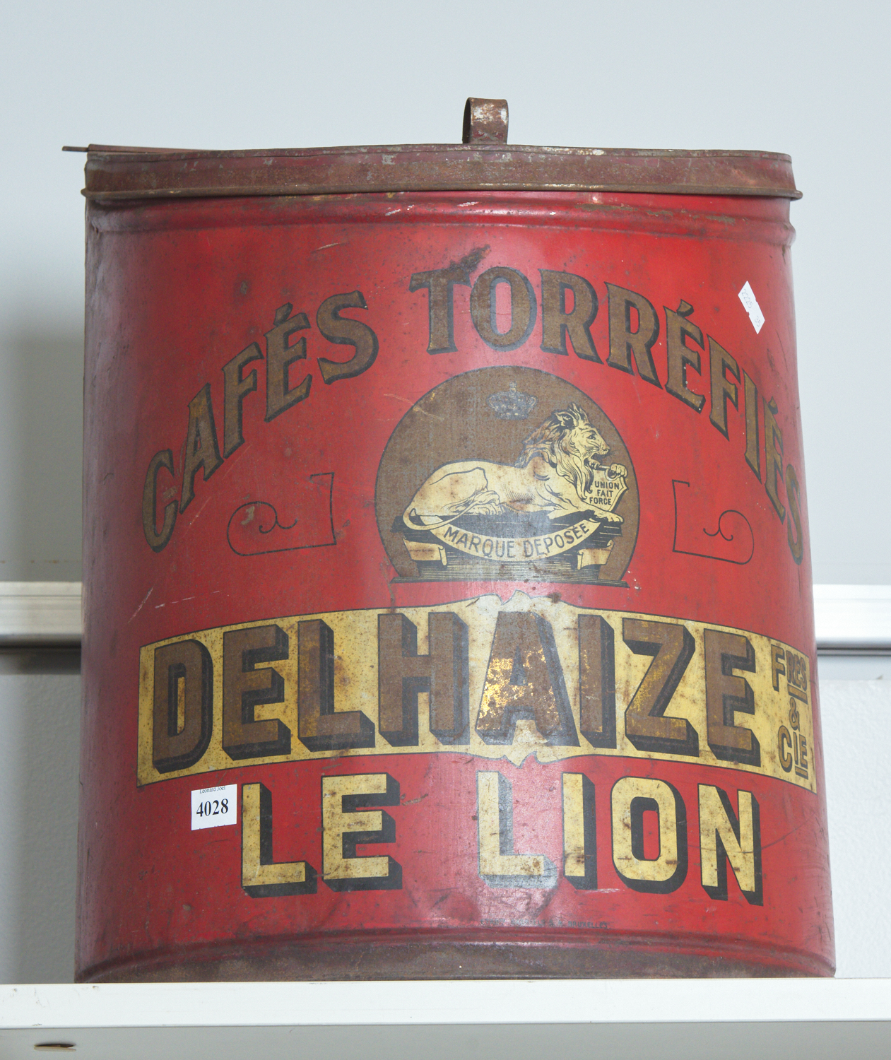 A LARGE 19TH CENTURY FRENCH CAFE TORREFIES DELHAIZE ADVERTISING TIN