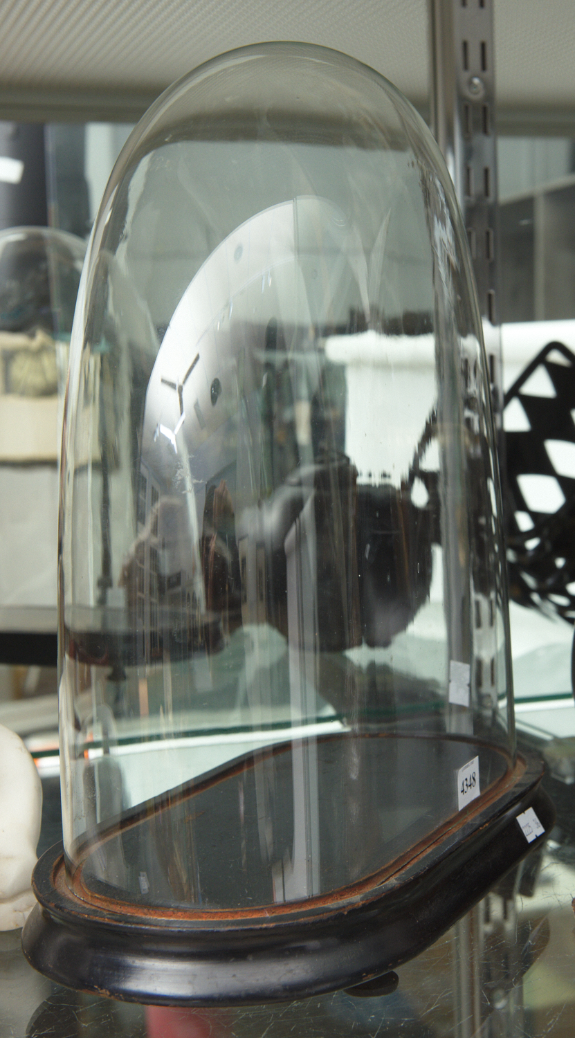 A 19TH CENTURY OVAL GLASS DISPLAY DOME WITH ORIGINAL EBONISED WOODEN BASE, dimensions of dome: 32.5 cm high; 27.5 cm wide; 12 cm depth; with base: 36.5 cm high; 30.5 cm wide