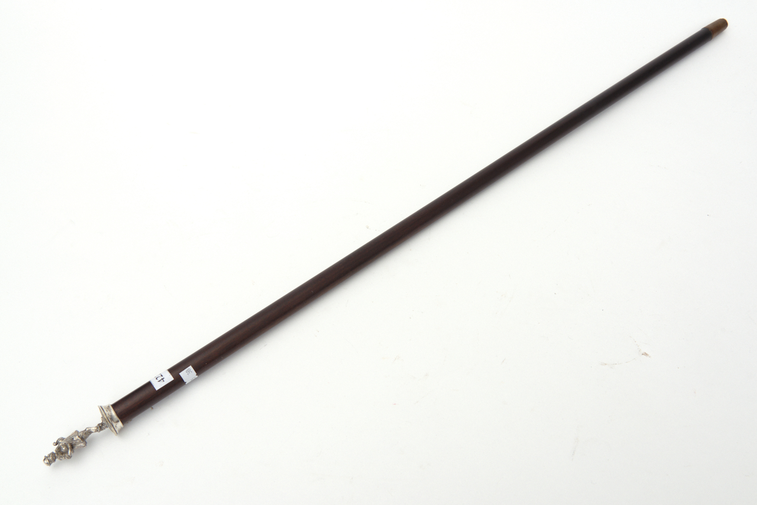 A SOLID SILVER FIGURAL TOPPED EBONY WALKING STICK WITH CHARLES DICKENS FIGURE