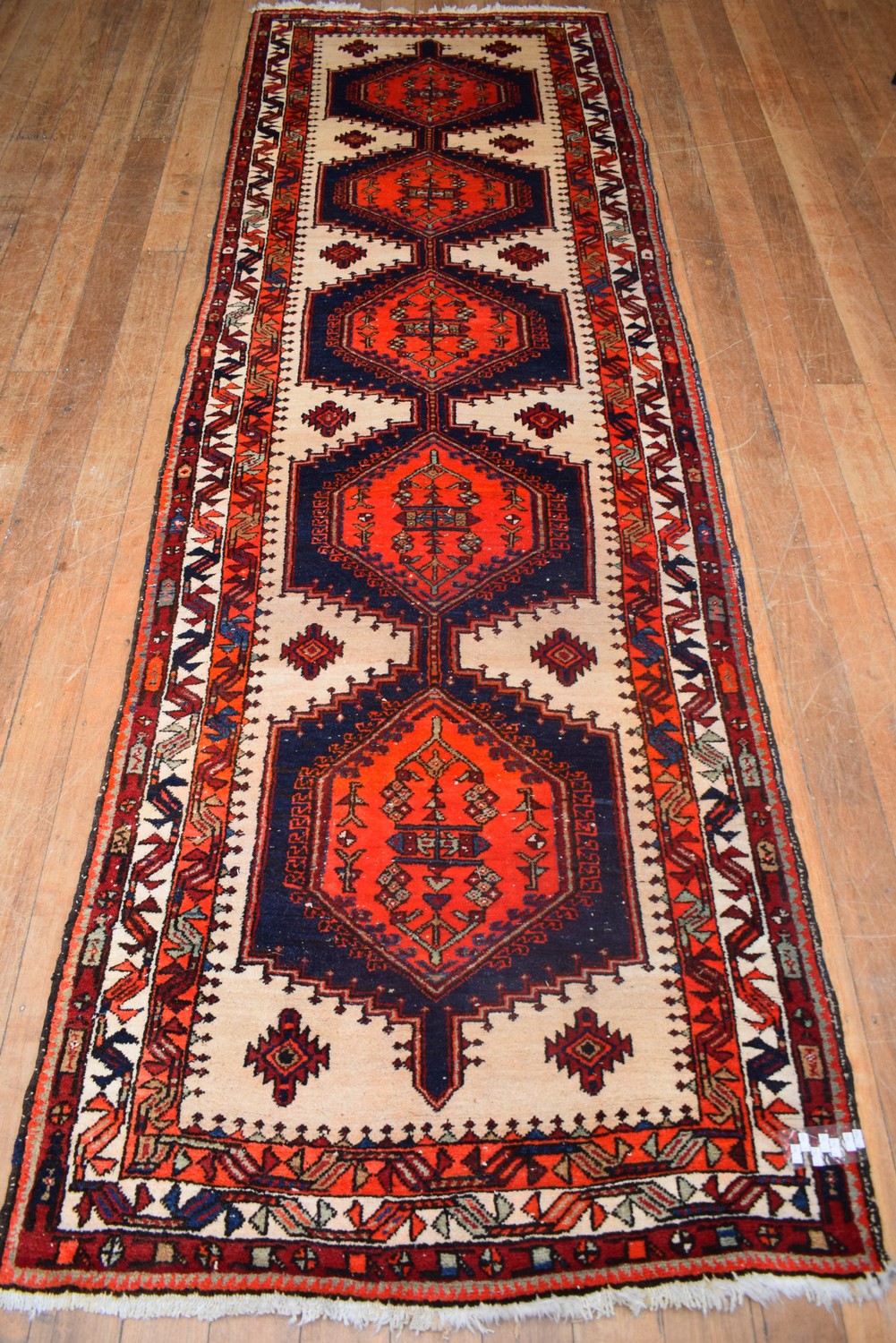 A VINTAGE QASHQAI 100% WOOL HANDMADE RUNNER IN RED AND CREAM TONES (A/F) (340 X 110 CM)