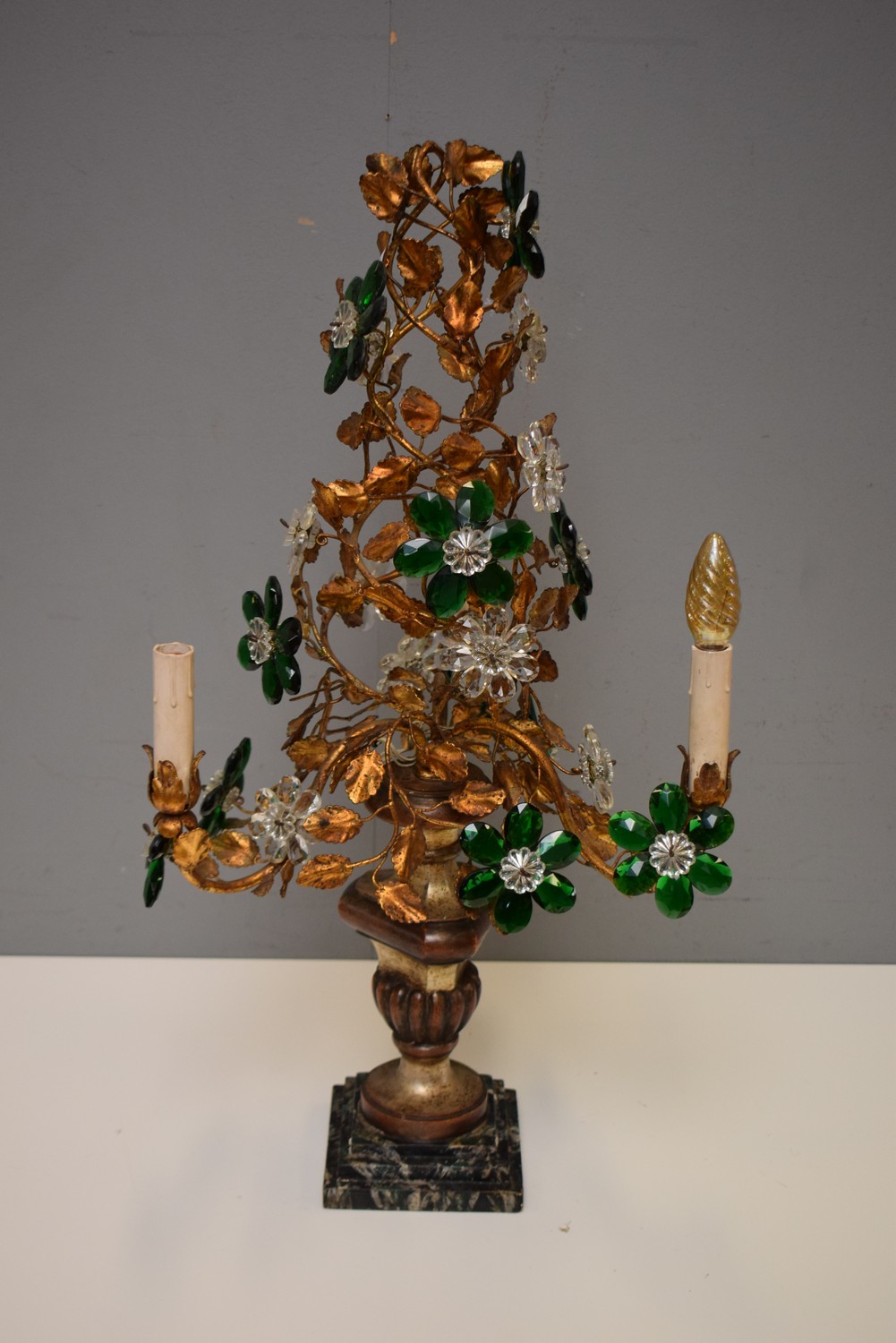 A 19TH CENTURY FRENCH GILDED WOODEN AND METAL LAMP WITH GLASS FLOWERS AND DECORATIONS (73 CM H) (A/F)