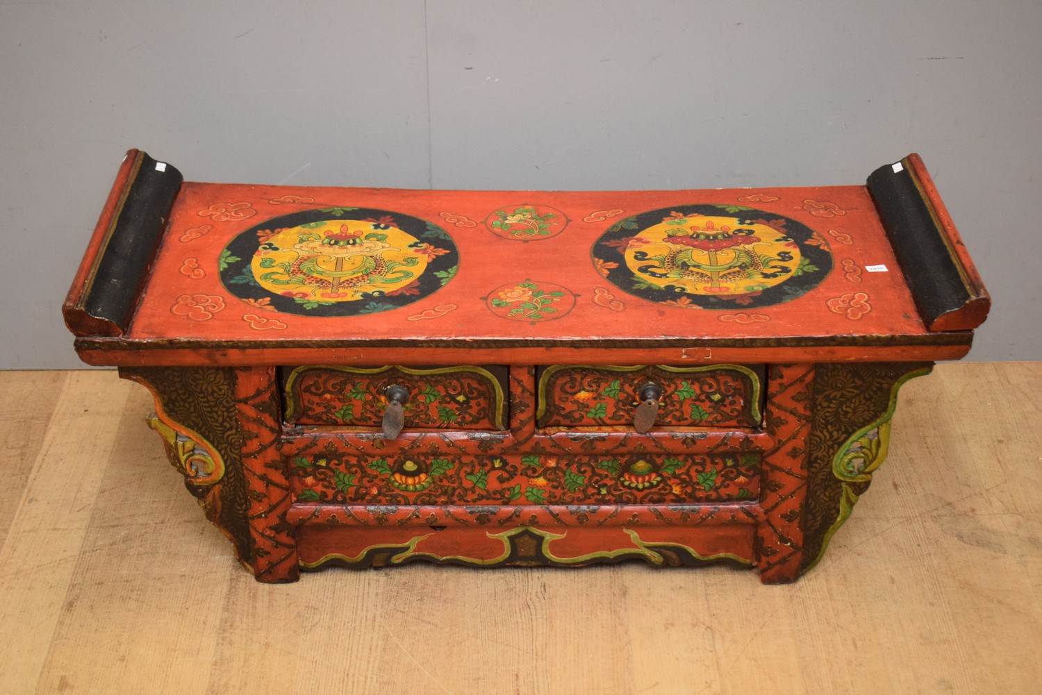 A SMALL HANDPAINTED CHINESE LOWLINE SIDEBOARD (46H X 110W X 42D CM)