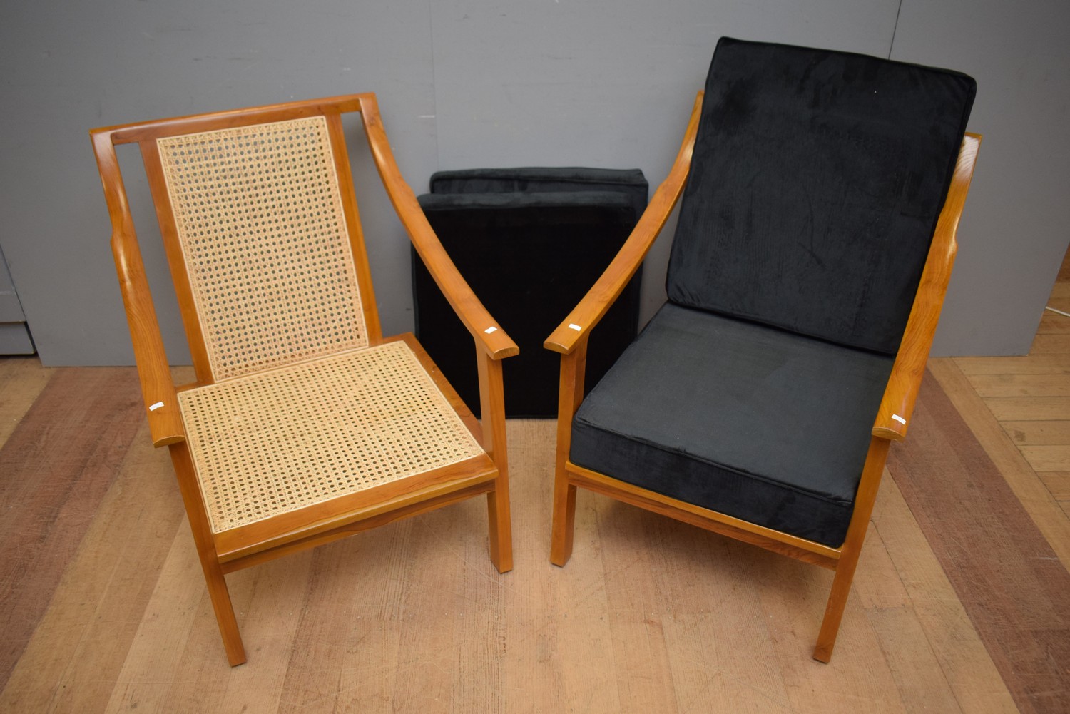 A PAIR OF TEAK AND RATTAN ACCENT CHAIRS (84H X 65W X 79D CM)