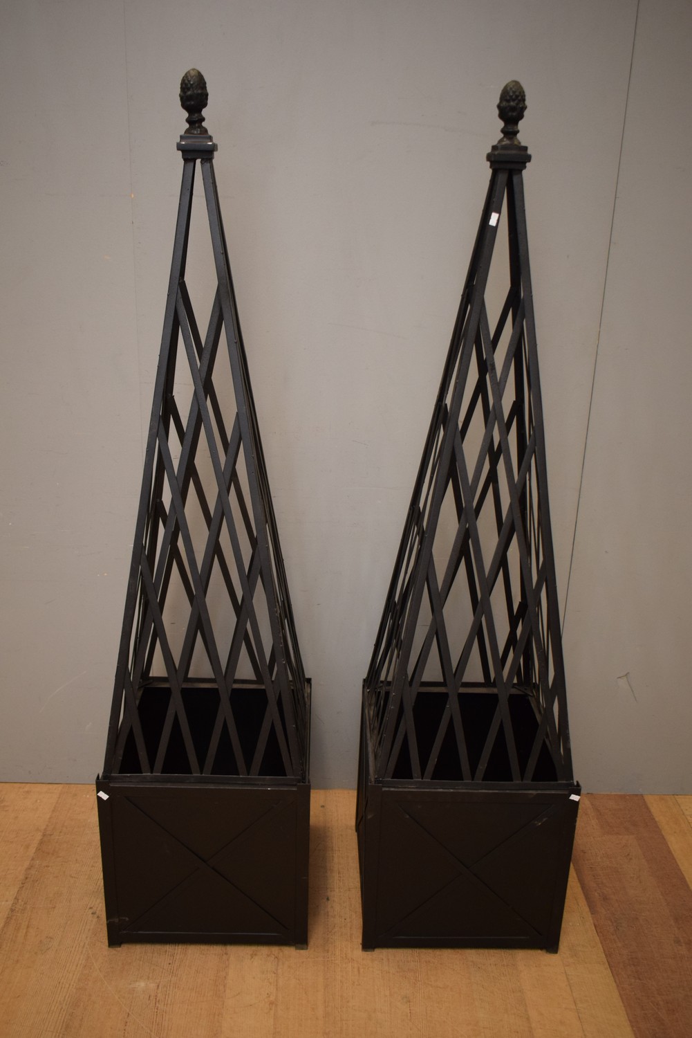 A PAIR OF METAL PLANTERS WITH FRAME SUPPORTS (184H X 45W X 45D CM)