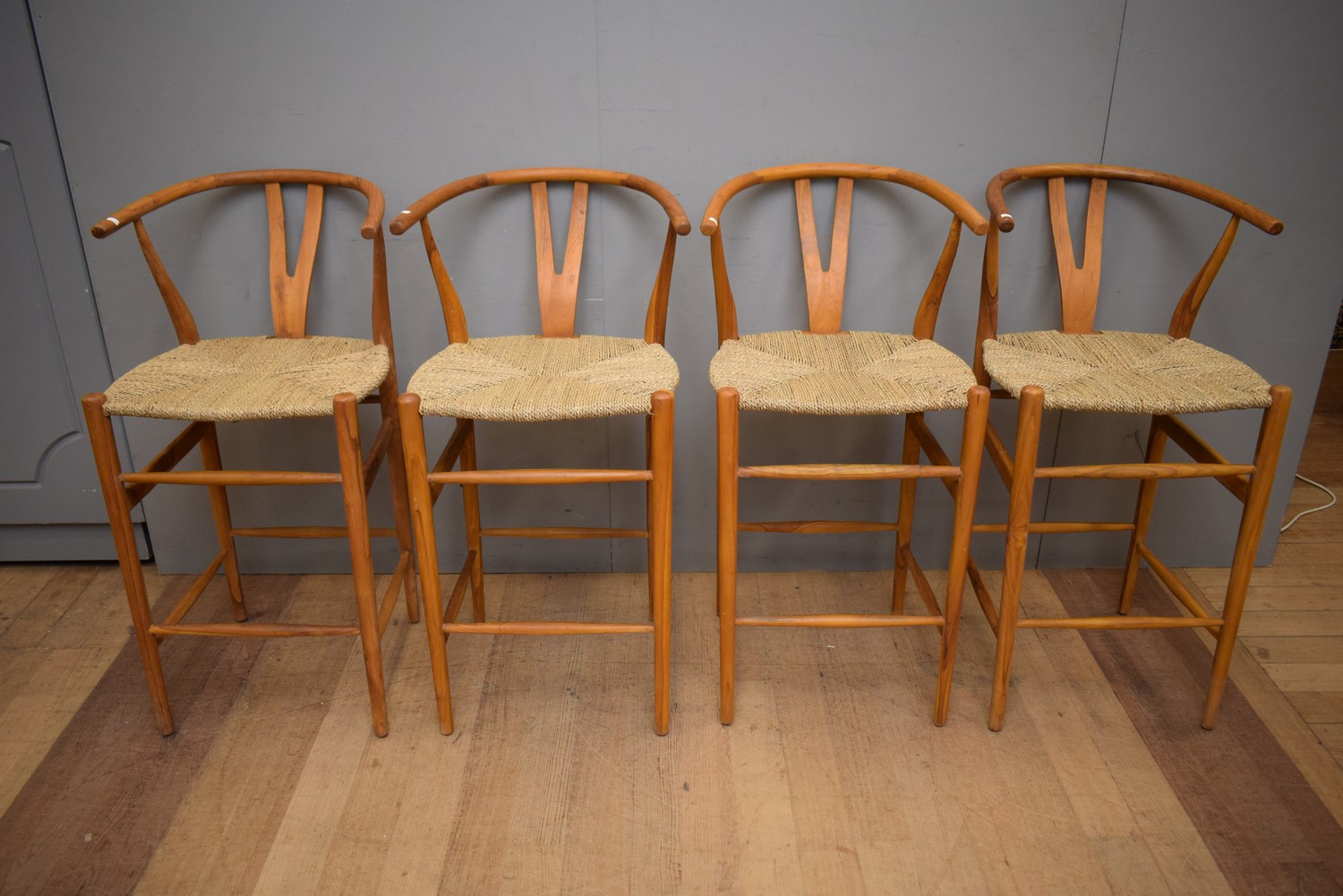 FOUR TEAK WISHBONE STYLE BAR STOOLS (105H X 55W X 60D CM)