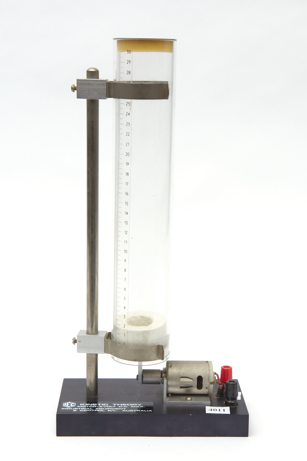 A KINETIC THEORY DEMONSTRATION MODEL, MAKER'S LABEL FOR INDUSTRIAL EQUIPMENT & CONTROL P/L AUSTRALIA, 6 VOLT MOTOR, 40.5 CM HIGH, 50 CM WIDE, 10 CM DEPTH, (UNTESTED)
