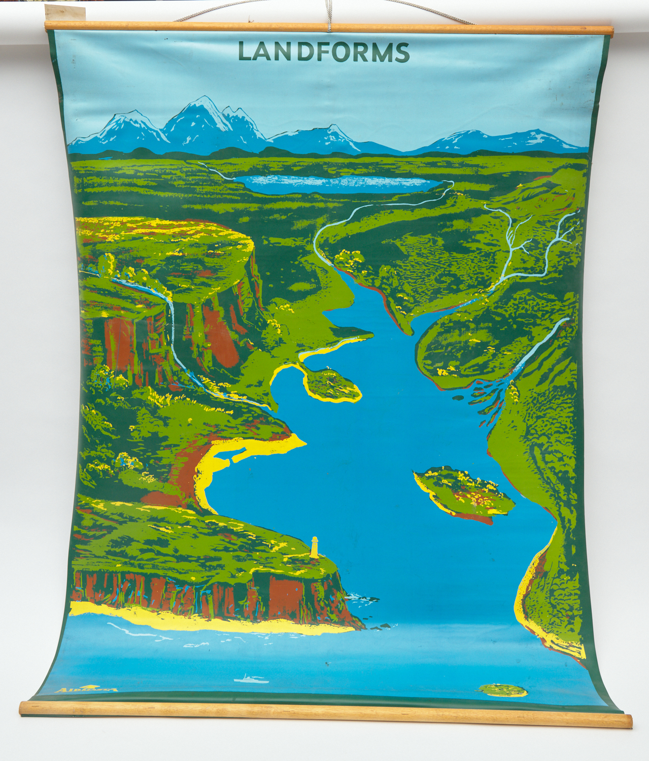 A VINTAGE DOUBLE-SIDED VINYL EDUCATIONAL WALL HANGING, 'LAND FORMS', (A/F, VERTICAL TEAR TO LEFT SIDE)