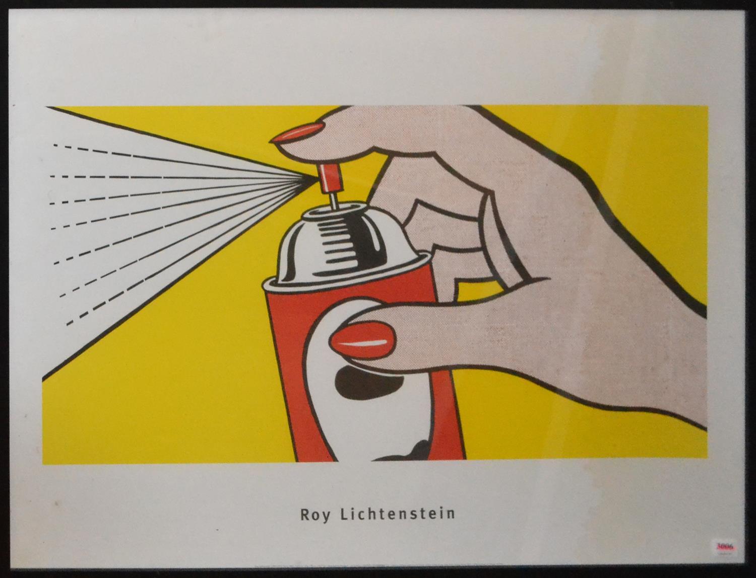 AFTER ROY LICHTENSTEIN, SPRAY CAN, REPRODUCTION PRINT, 38 X 73CM FRAME SIZE: 65 X 86CM CONDITION: WATER DAMAGE AND MOULDING BEHIND GLASS