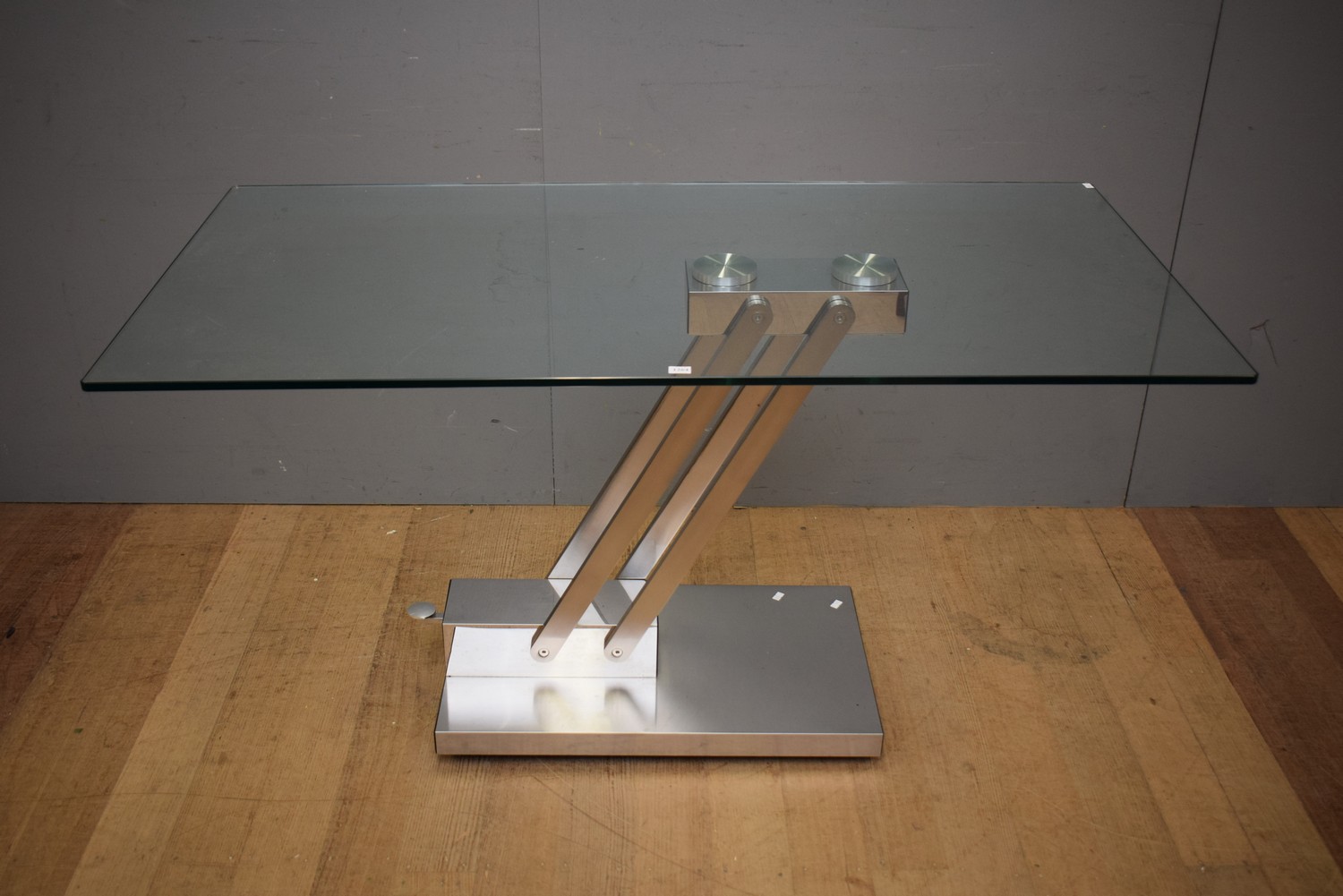 A MODERN GLASS TOPPED METAL FRAME ADJUSTABLE COFFEE/DINING TABLE (78 CM FULLY RAISED X 135W X 70D CM) (PLEASE NOTE THIS HEAVY ITEM MUST BE REMOVED BY CLIENTS OR CARRIERS AT THE CUSTOMERS EXPENSE. LEONARD JOEL STAFF CANNOT ASSIST CARRYING THIS ITEM)