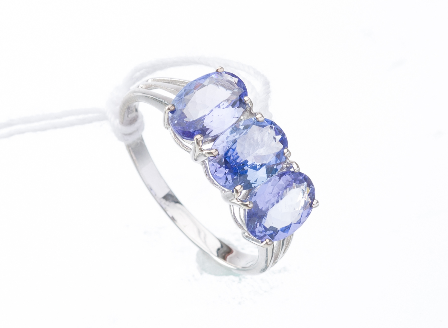 A THREE STONE RING SET WITH THREE OVAL CUT TANZANITE TOTALLING 2.25CTS, IN 9CT WHITE GOLD, SIZE M, 1.9GMS