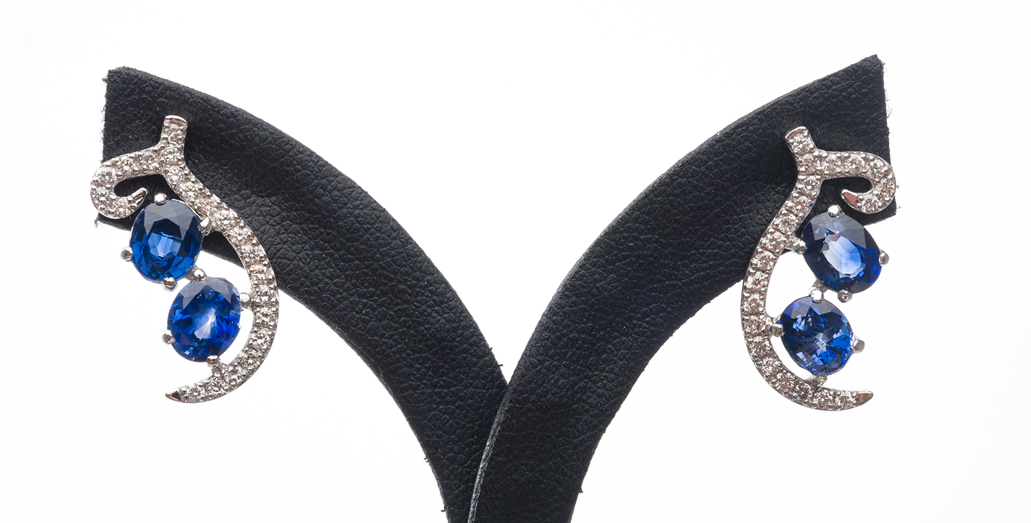 A PAIR OF SAPPHIRE AND DIAMOND EARRINGS IN 18CT WHITE GOLD, ORIGIN CEYLON, TOTAL LENGTH 20MM, 4.5GMS