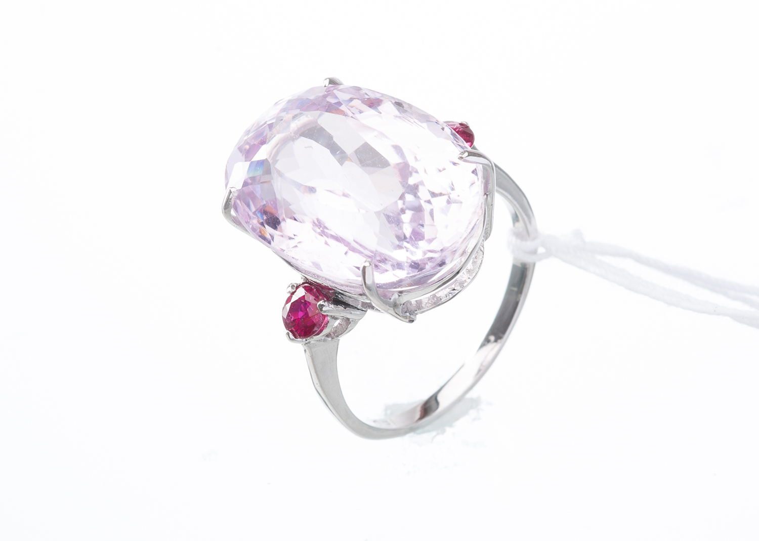 A KUNZITE AND RUBY DRESS RING IN 18CT WHITE GOLD, SIZE M, 6GMS