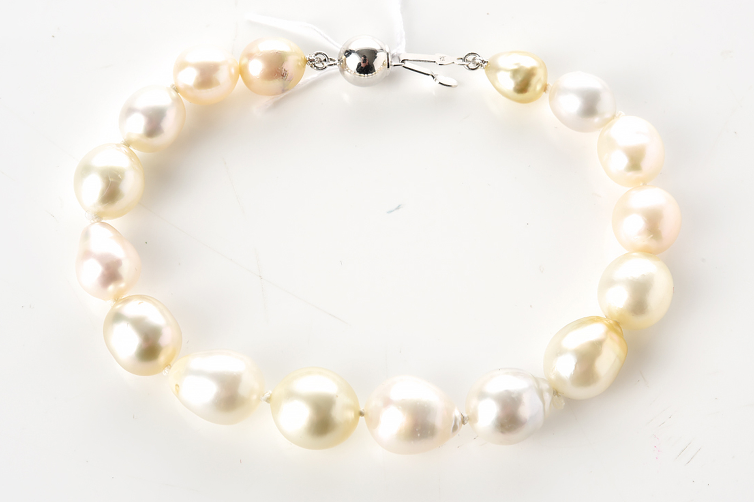 A MULTI-COLOURED BAROQUE SOUTH SEA PEARL BRACELET TO BALL CLASP IN STERLING SILVER, TOTAL LENGTH 200MM