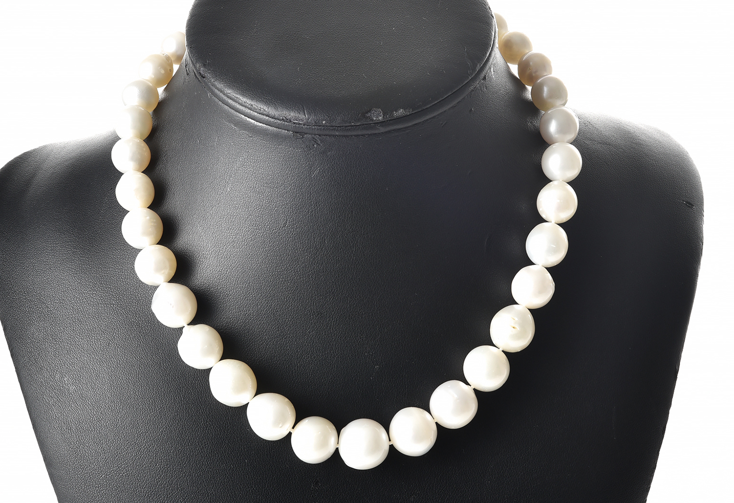 A STRAND OF SEMI BAROQUE SOUTH SEA PEARLS, GRADUATING IN SIZE 9.5MM TO 14.3MM TO A STERLING SILVER CLASP, TOTAL LENGTH 440MM