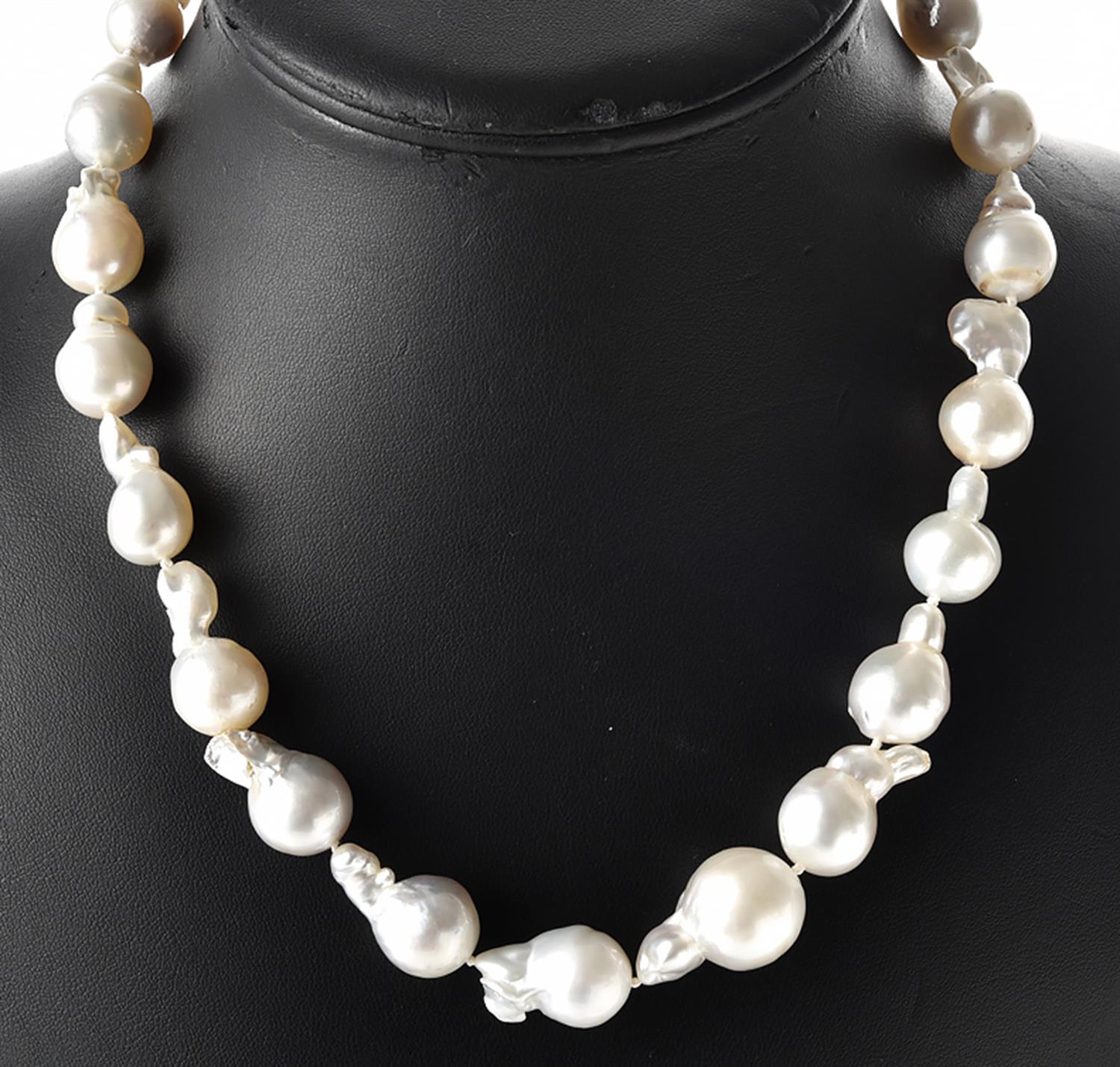 A STRAND OF BAROQUE SOUTH SEA PEARLS TO A BALL CLASP IN STERLING SILVER, TOTAL LENGTH 465MM