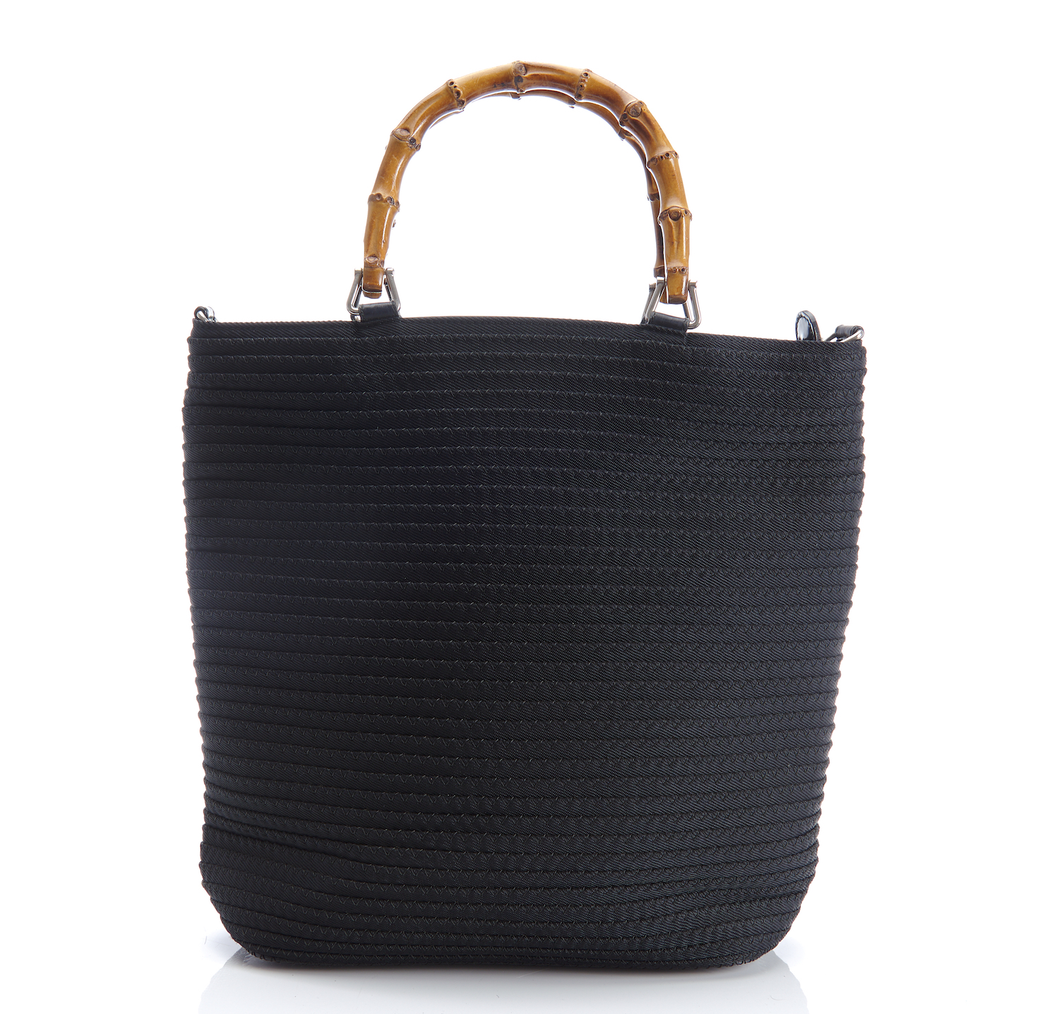 Styled in black nylon, with bamboo handles, silver metal hardware and detachable long strap, 32 x 30 x 9cm.