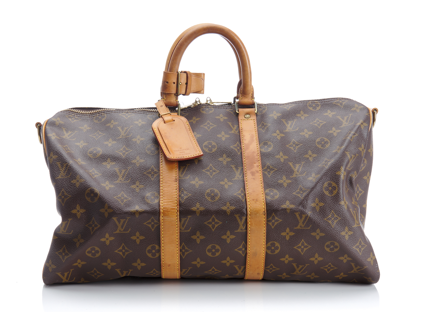 A KEEPALL BANDOULIERE 45 BY LOUIS VUITTON - Styled in monogram coated canvas with tan leather trim, long detachable strap and gold metal hardware, 45 x 26 x 20cm.