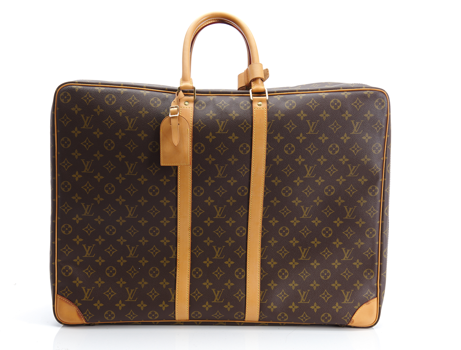Styled in brown monogram coated canvas with tan leather trim and golden brass metal hardware, 55 x 42 x 18cm.