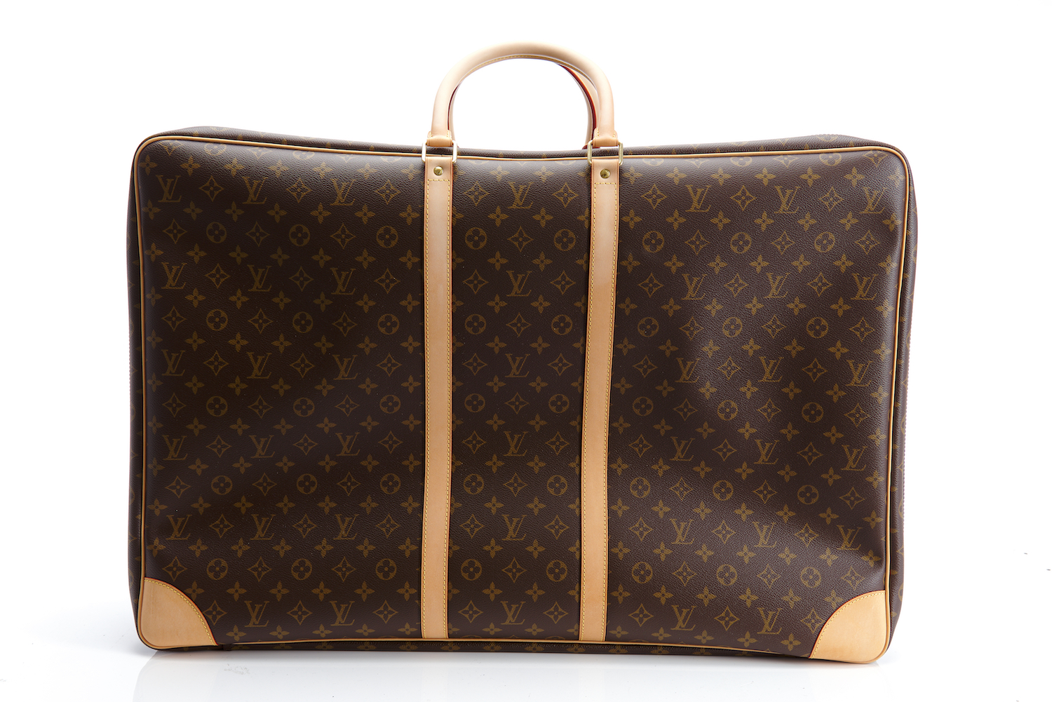 Styled in brown monogram coated canvas with tan leather trim and golden brass metal hardware, 70 x 49 x 21cm.