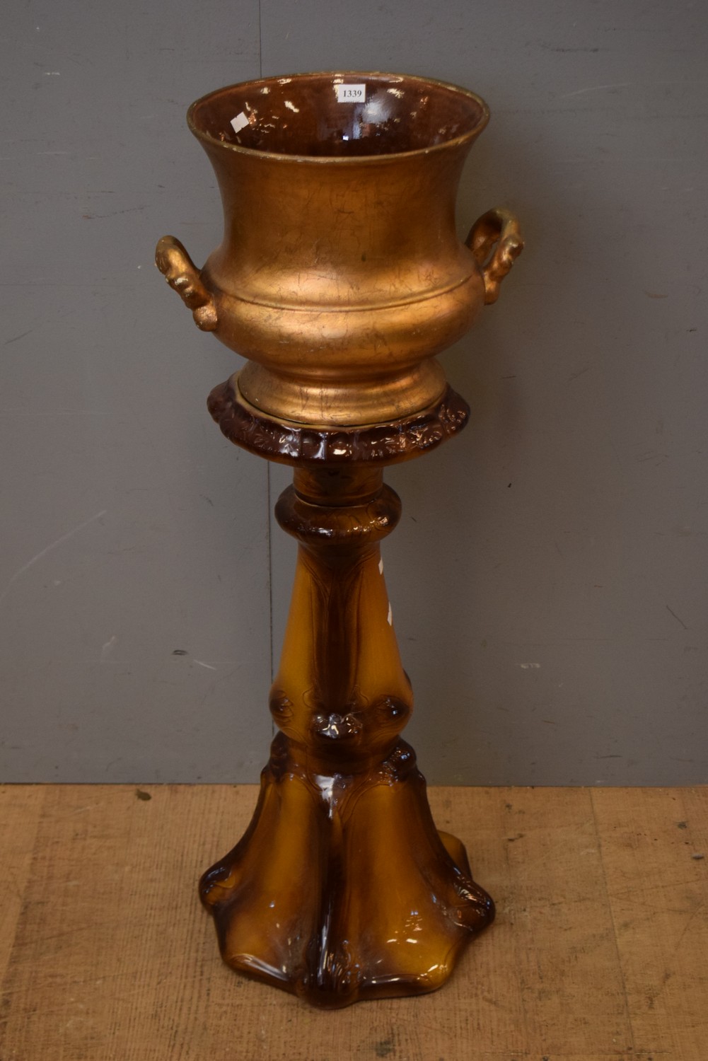 A DECORATIVE POT ON GLAZED CERAMIC PEDESTAL (OVERALL 89 CM H)