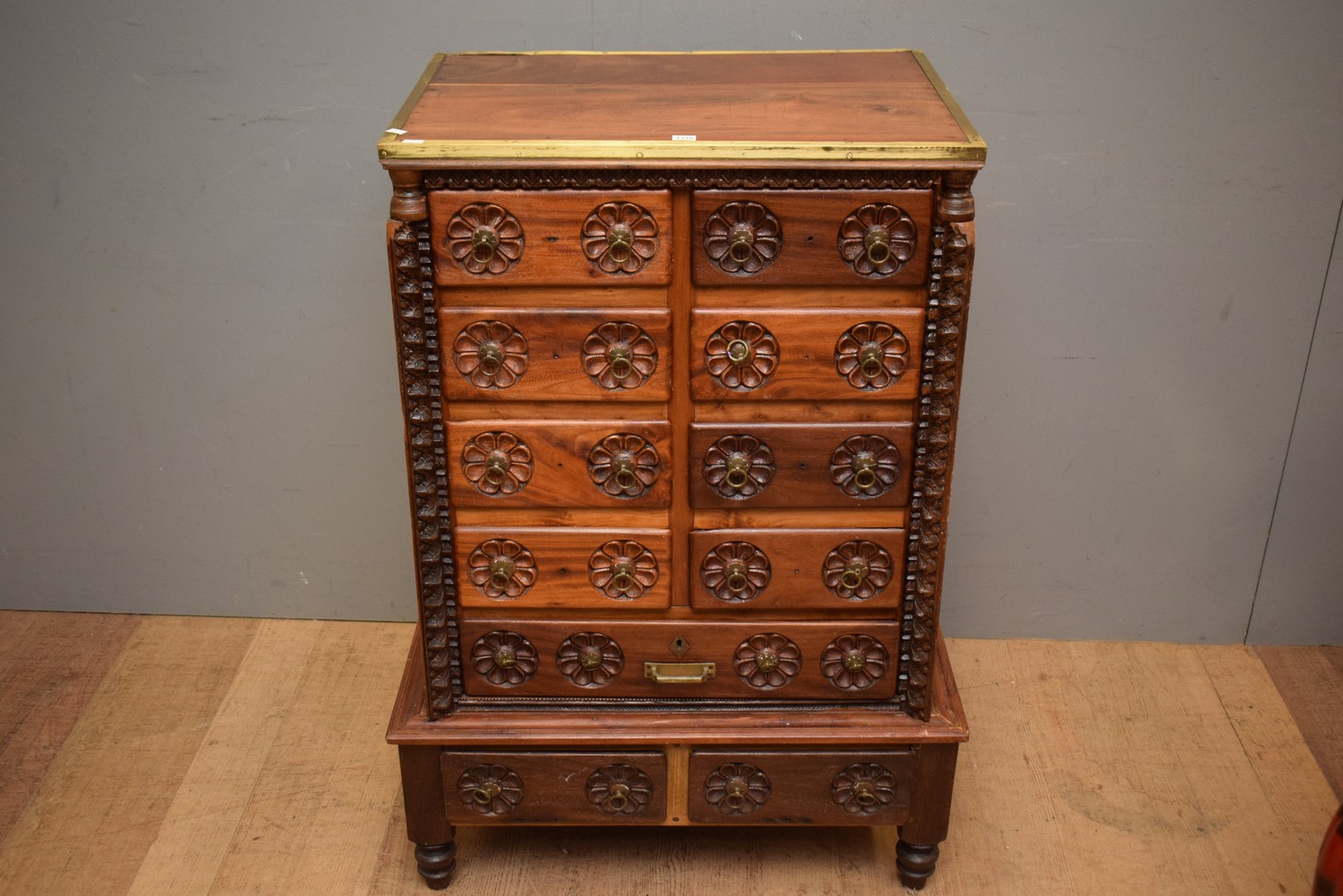 A DECORATIVELY CARVED BRASS BOUND CHEST OF DRAWERS (103H X 63W X 51D CM) (PLEASE NOTE THIS HEAVY ITEM MUST BE REMOVED BY CLIENTS OR CARRIERS AT THE CUSTOMERS EXPENSE. LEONARD JOEL STAFF CANNOT ASSIST CARRYING THIS ITEM)
