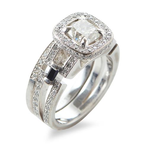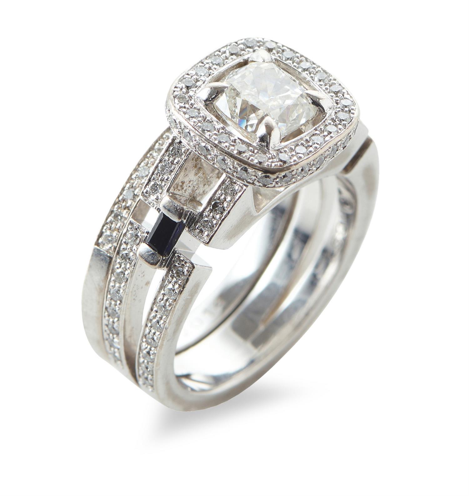 From the 'Metropolis' collection, featuring a cushion cut diamond weighing 1.30cts, within a geometric diamond set gallery and shank detailed with baguette cut sapphires, together with a diamond set band, in 18ct white gold, ring size N, with accompanying GIA diamond report number 5146204264, stating colour H and clarity SI1.