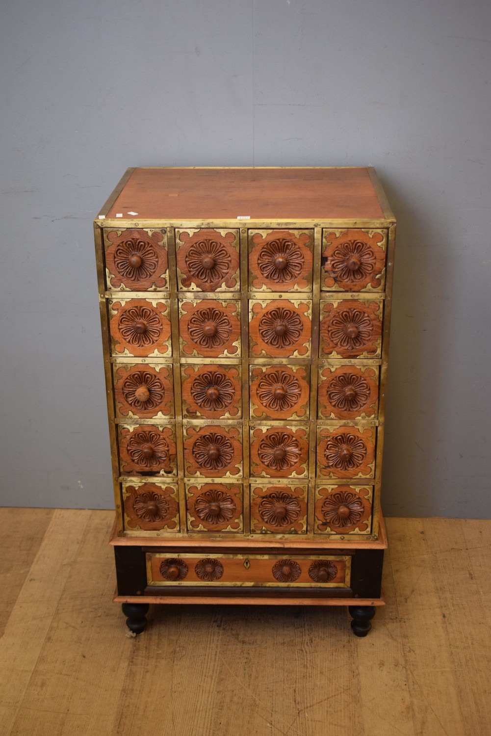 A TWENTY-ONE DRAWER DECORATIVELY CARVED SET OF DRAWERS (103H X 63W X 51D CM) (PLEASE NOTE THIS HEAVY ITEM MUST BE REMOVED BY CLIENTS OR CARRIERS AT THE CUSTOMERS EXPENSE. LEONARD JOEL STAFF CANNOT ASSIST CARRYING THIS ITEM)