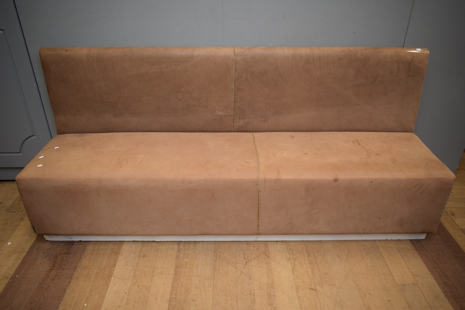 A CONTEMPORARY LEATHER BENCH SEAT (A/F) (101H X 227W X 67D CM) (PLEASE NOTE THIS HEAVY ITEM MUST BE REMOVED BY CLIENTS OR CARRIERS AT THE CUSTOMERS EXPENSE. LEONARD JOEL STAFF CANNOT ASSIST CARRYING THIS ITEM)