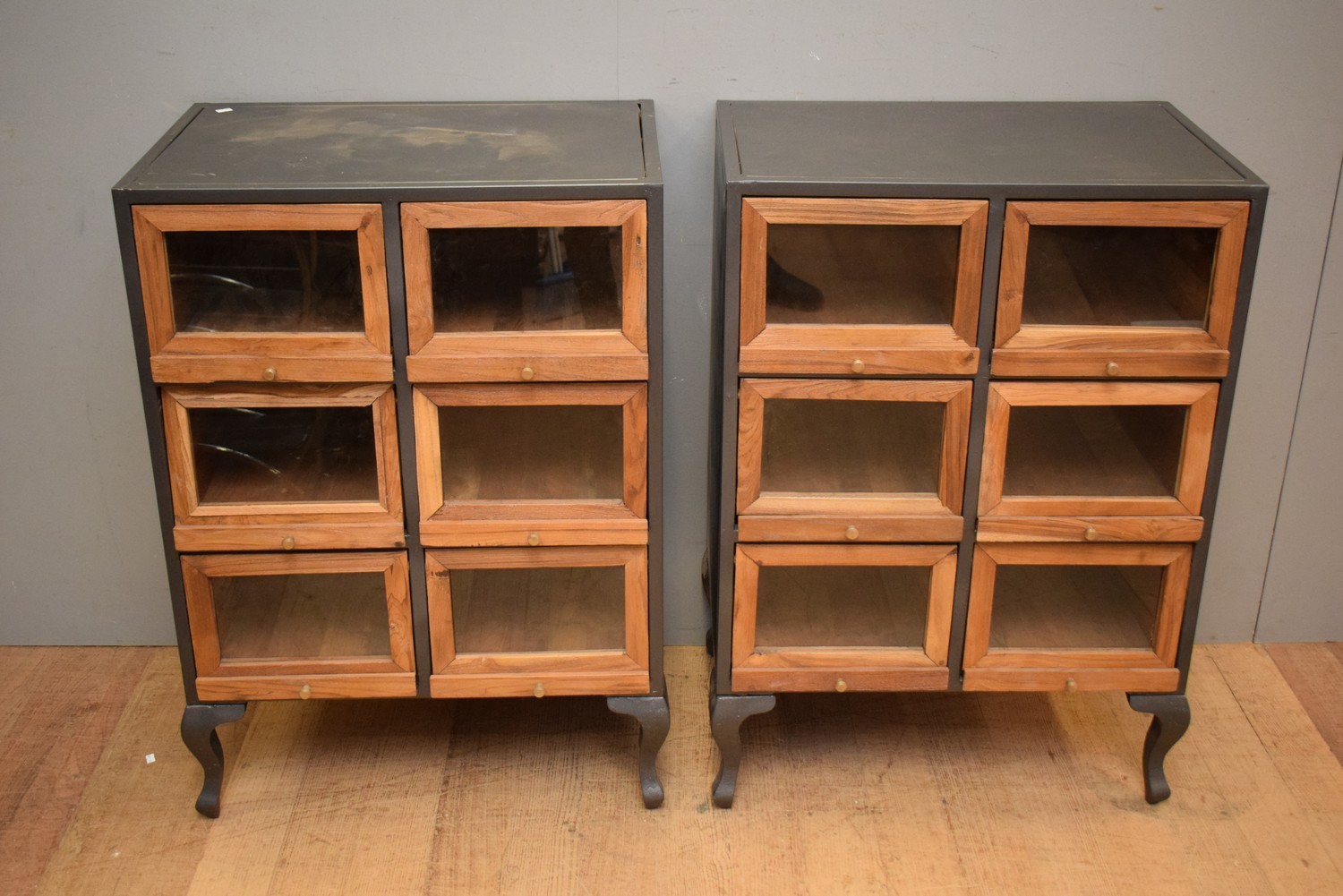 A PAIR OF SIX DRAWER METAL AND GLASS DISPLAY CABINETS (A/F TO DRAWERS) (95H X 67W X 45D CM)